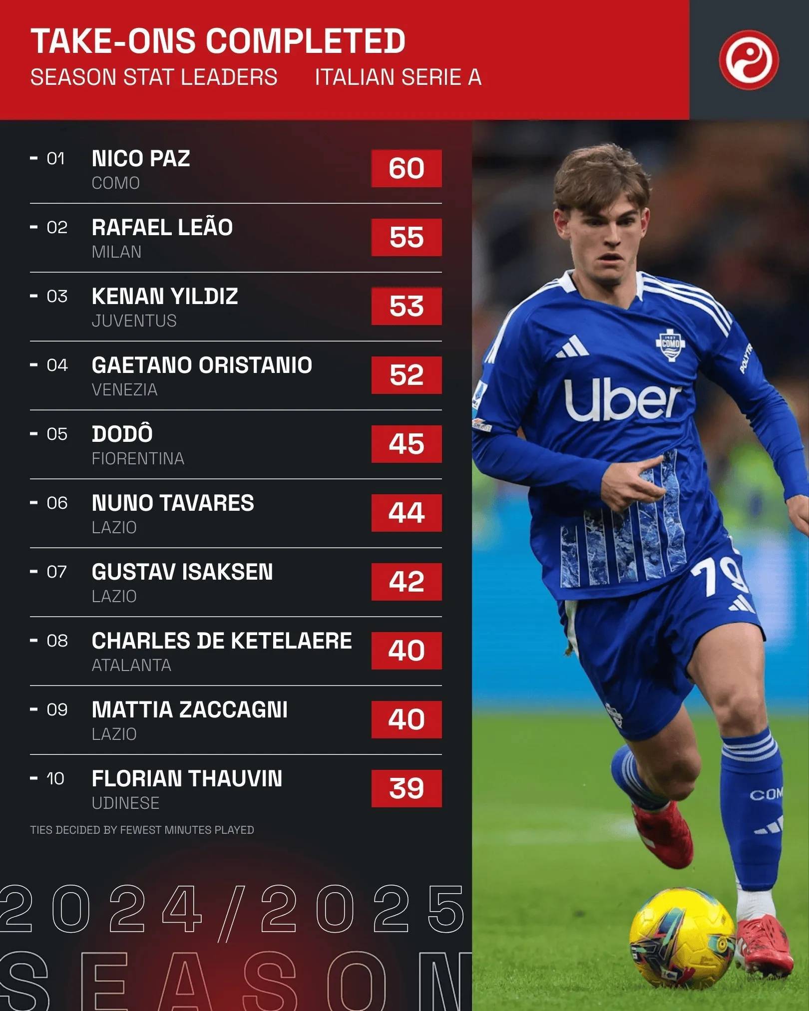 意甲过人榜:帕斯60次居首,莱奥55次第二,伊尔迪兹53次第三