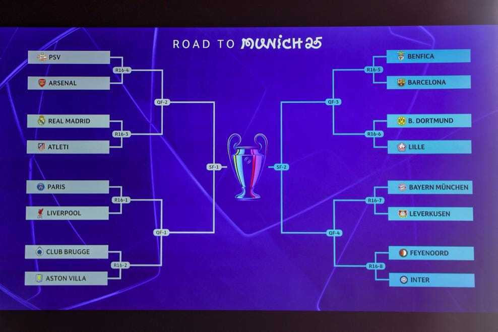 北京时间2月21日,2024-25赛季欧冠联赛抽签仪式在瑞士尼翁的欧足联总部进行。抽签的对阵结果如下: